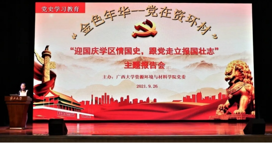 9月26日晚,我院在大礼堂开展“金色年华·党在资环材——迎国庆学区情国史,跟党走立报国壮志”主题报告会,报告会邀请了广西革命纪念馆的讲解员围绕广西新民主主义革命时期历史、社会主义革命和建设时期历史两个专题宣讲。学院党委书记沈大强、副书记吴达慧与师生党员代表及2021级全体新生共同参加了报告会。