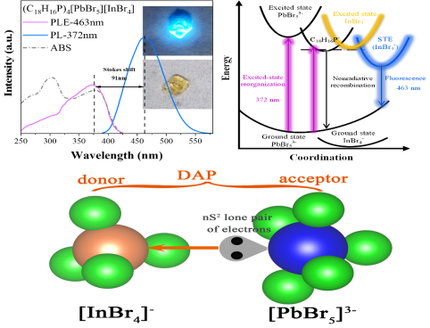 In作为一种潜力巨大的蓝光发射元素,其在金属卤化物中主要以[InX6]3-八面体和[InX4]-四面体的形式存在。相比于[InX6]3-八面体,[InX4]-四面体结构的刚性更强,这有利于Stokes shift的减小。但遗憾的是以往的报道全都是关于[InX6]3-八面体,尚未有对[InX4]-四面体研究的报道。该工作首次实现了[InBr4]-四面体的高效蓝光发射。在372nm紫外光激发下,(PPh3H)4[PbBr5][InBr4]可以实现高效的蓝光发射,光致发光量子产率为74.03%,发射中心为463nm。小的Stokes shift来源于刚性的有机框架和[InBr4]-四面体,高效的蓝光发射来源于零维[InBr4]-四面体的自陷态激子(STE)。这项工作为高效蓝光发射金属卤化物的研究提供一个全新的思路。