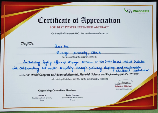 太阳集团网址8722院长邹炳锁教授等一行4人应邀出席,其中邹炳锁教授做了题为“Excitation and Optical Properties of Diluted Magnetic Semiconductor Nanostructures”的邀请报告。博士研究生科宝展示的墙报“Achieving Highly Efficient Orange Emission in Tin (IV)-based Metal Halides with Outstanding Anti-water Stability through Antimony Doping and Reasonable Structural Modulation”获最佳墙报奖。