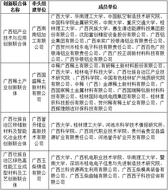 本次获批的联合组建的创新联合体太阳网集团tcy8722参与的共6项,其中属于我院科研团队联合的有4项,涵盖铝产业、稀土产业、锌锗新材料及智能化冶金技术、绿色高性能工业成型材料及工艺等多个领域,包括:广西铝产业技术与应用创新联合体、广西稀土产业创新联合体、广西壮族自治区锌锗新材料及智能化冶金技术创新联合体、广西壮族自治区绿色高性能工业成型材料及工艺创新联合体。创新联合体分别由广西南南铝加工有限公司、广西国盛稀土新材料有限公司、广西誉升锗业高新技术有限公司、广西玉柴铸造有限公司四家龙头企业牵头组建,汇聚了太阳网集团tcy8722与知名高校、科研机构和众多骨干企业的科研攻关力量。