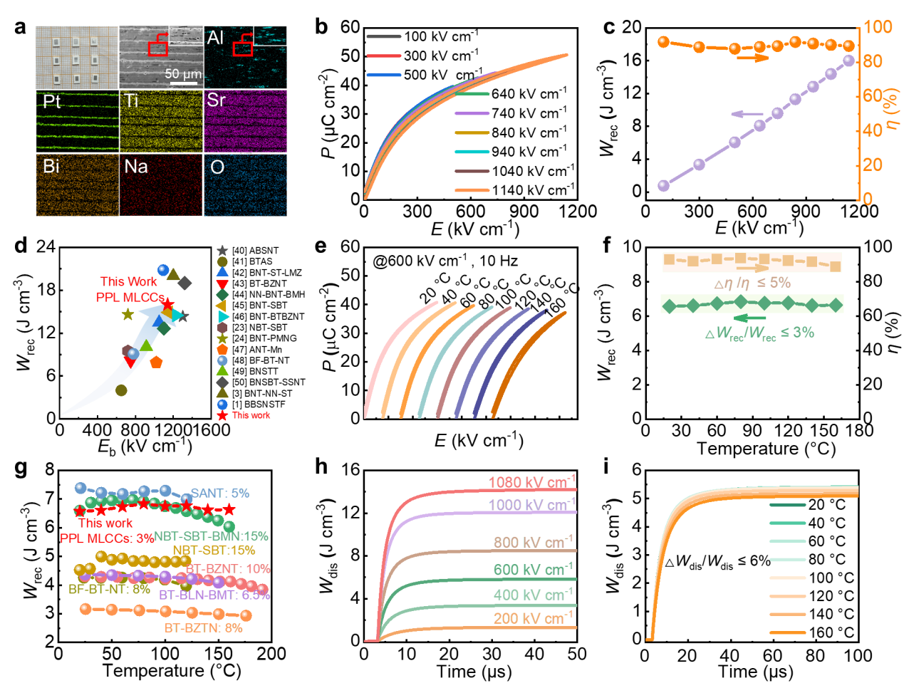为解决该难题,我院罗能能教授团队提出一种全新策略:在无铅弛豫铁电基体中嵌入平行排列的Al2O3片状模板,构建大量有序排列的异质界面。在强电场和高温条件下,这种有序异质界面能有效抑制电荷注入和传输,显著降低电导率与能量损耗,从而实现高击穿强度与高热稳定性。基于该结构,复合块体陶瓷的击穿强度和储能密度分别提高2.6倍和2.2倍,储能密度在20℃-160℃的变化率从~10%降低至~2%。值得注意的是,以该电介质材料制备的MLCCs的击穿强度高达1140 kV cm-1,储能密度达16.0 J cm-3。此外,该MLCCs在20℃-160℃的宽温范围内表现出优异的热稳定性,性能波动幅度不超过3%。这些结果表明,有序异质界面工程在开发兼具高热稳定性和高储能密度的材料方面具有重要潜力。