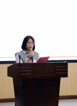 大会第二阶段,学院研究生会主席团成员雷天蔚同学代表我院第四届研究生会作工作报告,与会代表认真听取并审议通过。大会选举谢泽昕、韦柳亦和苏欣为我院第五届研究生会主席团成员,谢泽昕向全体与会代表宣读了新一届研究生会倡议书。