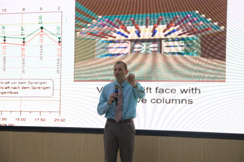 报告会上,Heinz Konietzky教授首先介绍了德国弗莱贝格工业大学的基本情况,随后展示了弗赖贝格工业大学岩土工程研究所在岩石力学室内试验、数值仿真以及地下岩石实验室等岩石力学基础理论和应用研究方面取得的最新研究成果。此外,Heinz Konietzky教授还分享了近年来他所带领的团队在岩石力学及地下采矿、核废料处置等方面取得的一些重要成果。这些成果展示了其团队在数值模拟、现场监测和室内试验等方面的综合实力。最后,Heinz Konietzky教授表达了他对太阳网集团tcy8722青年教师及科研人员进行合作、共同探索岩土工程领域的深切期望。