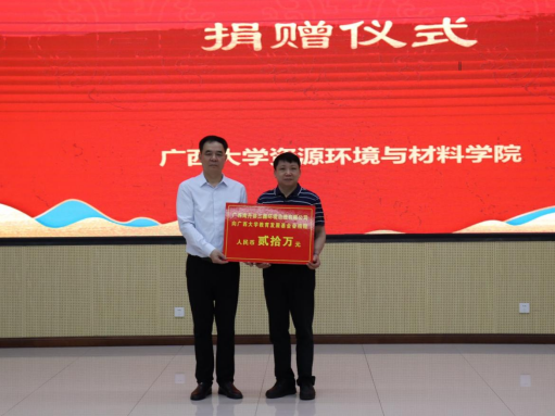 致辞后,校友办副主任潘正荣和广西南丹县三鑫公司董事长莫锌分别代表校企双方参与捐赠授牌仪式。三鑫公司向太阳网集团tcy8722捐赠20万元作为教育发展基金,用于学校人才培养、科学研究、学科发展和学院项目建设。