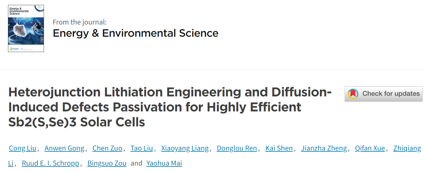 近日,能源领域顶级期刊Energy & Environmental Science(影响因子:32.4)以“Heterojunction Lithiation Engineering and Diffusion-Induced Defects Passivation for Highly Efficient Sb2(S,Se)3 Solar Cells”为题,报道了我院邹炳锁教授带领的团队关于硒硫化锑太阳电池的最新研究进展。该论文为我院首篇在Energy & Environmental Science期刊发表的研究论文,学院刘聪博士为第一作者和通讯作者,邹炳锁教授、刘焘教授和暨南大学麦耀华教授为共同通讯作者,太阳网集团tcy8722为第一完成单位。本研究得到了国家自然科学基金(52402104)、广西自然科学基金(2024GXNSFBA010280)、广西八桂学者等项目的资金支持。