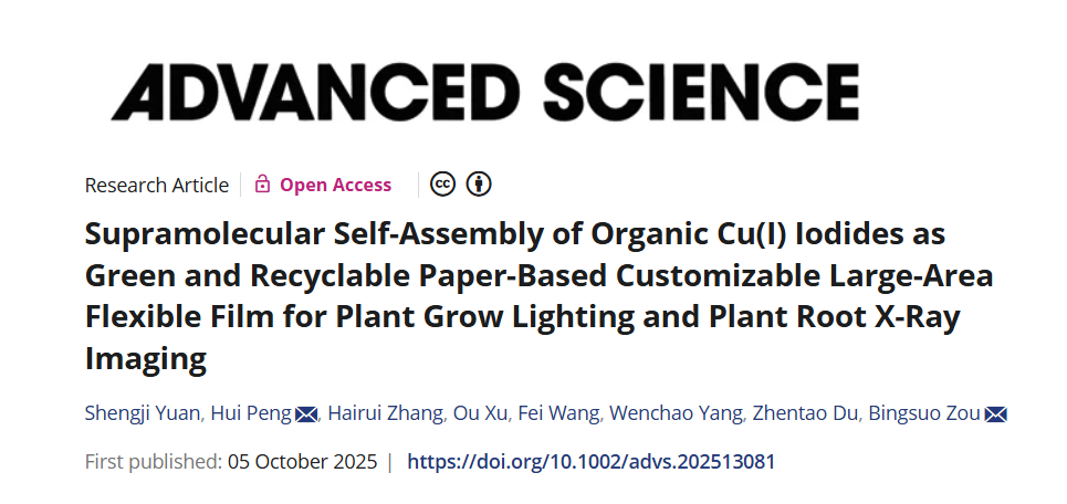 该团队通过超分子自组装策略,成功开发出一种基于滤纸和有机铜碘化物的可定制、大面积、可回收、可生物降解的柔性发光薄膜,并成功构建了一个集植物生长照明与植物根部X射线成像于一体的双功能平台。该研究成果以题为《Supramolecular Self-Assembly of Organic Cu(I) Iodides as Green and Recyclable Paper-Based Customizable Large-Area Flexible Film for Plant Grow Lighting and Plant Root X-Ray Imaging》发表于国际顶级学术期刊《Advanced Science》(IF = 14.1),彭辉博士和邹炳锁教授为共同通讯作者,硕士研究生袁升记为第一作者。太阳网集团tcy8722为第一完成单位。
