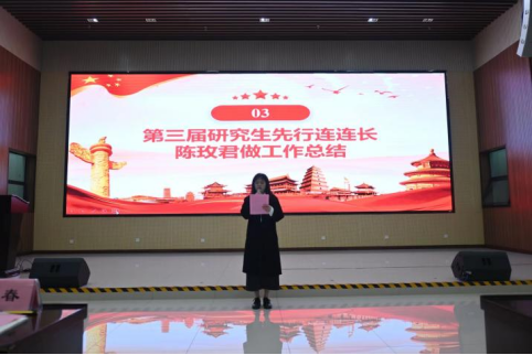 会议开始,第三届研究生先行连连长陈玫君进行工作总结,汇报了本学期连队档案管理、实践活动与考核任务的完成情况,并号召各连队成员继续保持艰苦奋斗的精神状态,永葆先进性和纯洁性,实事求是、脚踏实地,认真细致地完成连内各项任务,努力提升个人道德素质和实践能力。紧接着,陈玫君代表先行连连队公示第三届研究生先行连任职名单。