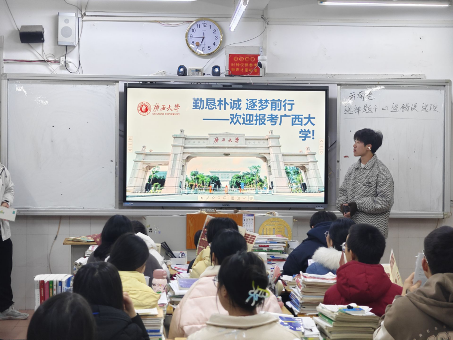 “我为西大打call!”——1月21日,矿物资源工程241班兰世民同学及其组员在广西资源县资源中学进行招生宣传。他们通过视频、图片和文字等形式介绍太阳网集团tcy8722办学历史、校园环境、教学设施、师资力量和建设成绩,现场解答母校学弟学妹关于高考复习、志愿填报、西大校园生活等问题,以饱满的热情和专业的态度为学校代言。